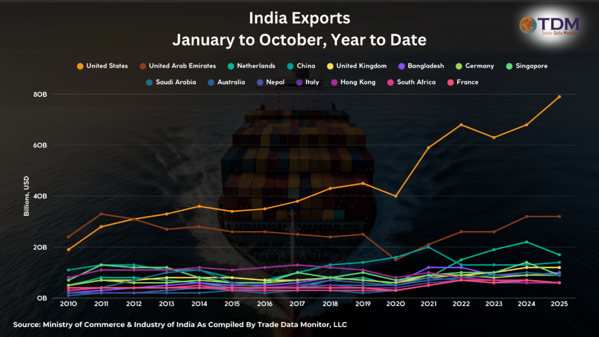 | 7. Indian ExportsNow with the world’s biggest population, India has now overtaken Japan as the world’s fourth biggest economy, behind the U.S., China and Germany. Its top market: the U.S., followed by UAE and the Netherlands. |