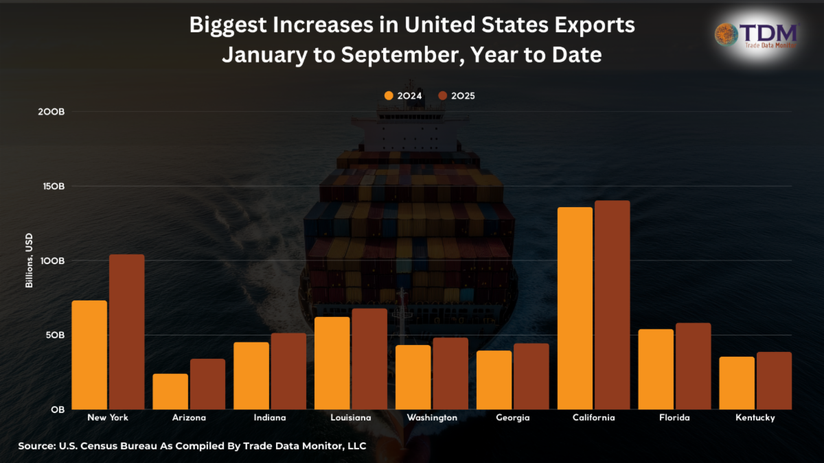 9. What States’ Ports and Economies Are Thriving MostAmerica is a huge continental economy with dozens of distinct economic regions and sea- and airports. We sorted every state by increase year-on-year in exports from the place it’s leaving the U.S., over the first nine months of 2025. Texas and California are still the biggest exporters overall, but New York leads the race in year-on, because of its trade in physical gold. Arizona ranks second because of its electronics trade with Mexico. Third is Indiana, thanks to its exports of hormones to Italy.