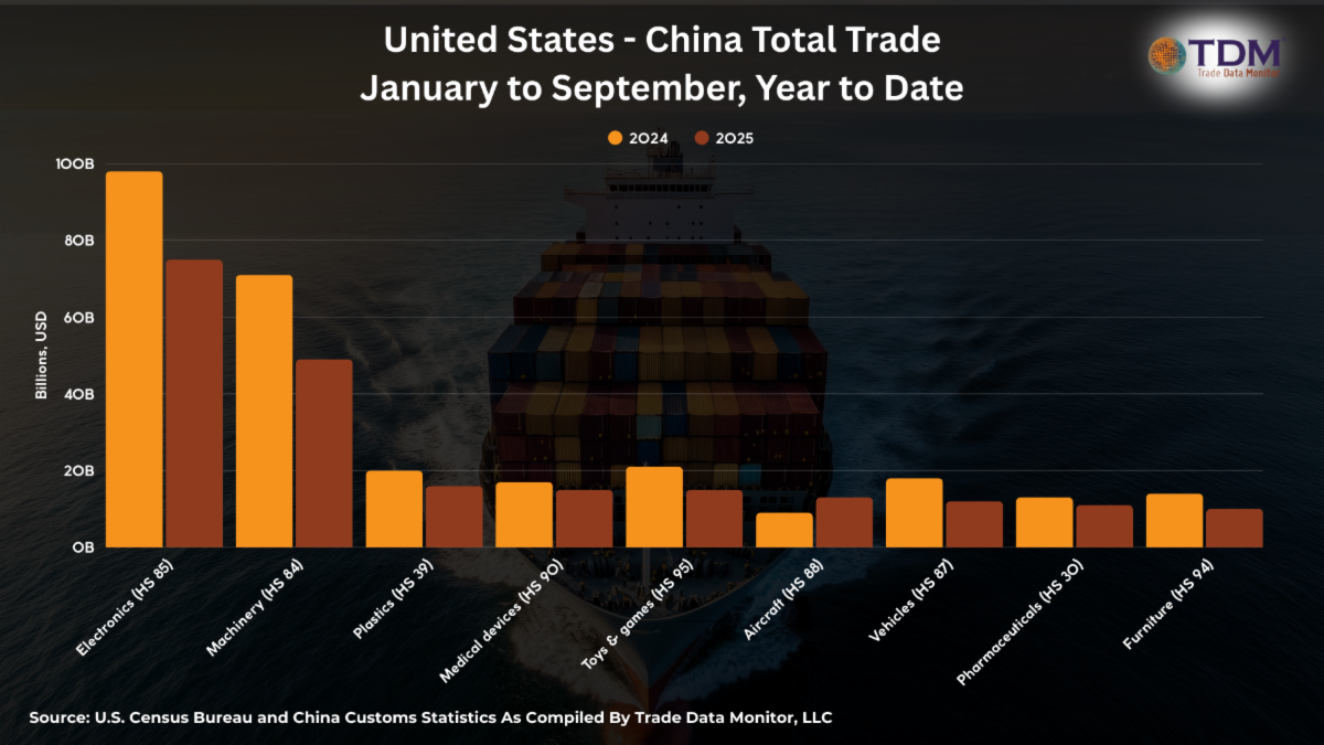 | 3. Where is U.S.-China Trade Headed?The future of the U.S.-China trade relationship seems uncertain at best. When we added up total trade between the two behemoths, the only sector has grew in 2025 was aircraft. The U.S. shipped $12.5 billion of aircraft and aircraft parts to China in the first nine months of 2025, up 45% from the same period in 2024. |
