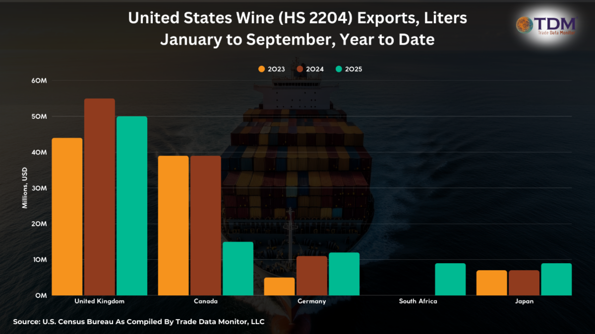 8. Trade Case Study: EgyptTrade coverage focuses on the big countries, but we’ve been studying smaller players, and one interesting case study is Egypt. It’s been boosting apparel exports, a sign of a country’s increasing prosperity and competitiveness on export markets. In 2025, Egypt clocked the biggest increase in apparel exports, shipping out $2.6 billion in the first nine months of 2025, 30.7% more than the year before. The second highest increase was registered by Cambodia at 16.9%, and no other country improved by double digits. 9. What States’ Ports and Economies Are Thriving MostAmerica is a huge continental economy with dozens of distinct economic regions and sea- and airports. We sorted every state by increase year-on-year in exports from the place it’s leaving the U.S., over the first nine months of 2025. Texas and California are still the biggest exporters overall, but New York leads the race in year-on, because of its trade in physical gold. Arizona ranks second because of its electronics trade with Mexico. Third is Indiana, thanks to its exports of hormones to Italy. 10. U.S. Wine ExportsA retaliatory tariff and a “Buy Canadian” movement have dented U.S. wine exports to its northern neighbor. Instead, U.S. producers are finding replacement markets in Germany, South Africa and Japan. |